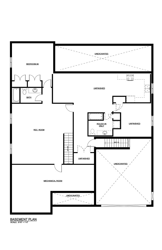 Basement plan includes one bedroom, large rec room, and a three-piece bathroom with rough-ins for a future granny flat in the unfinished area.