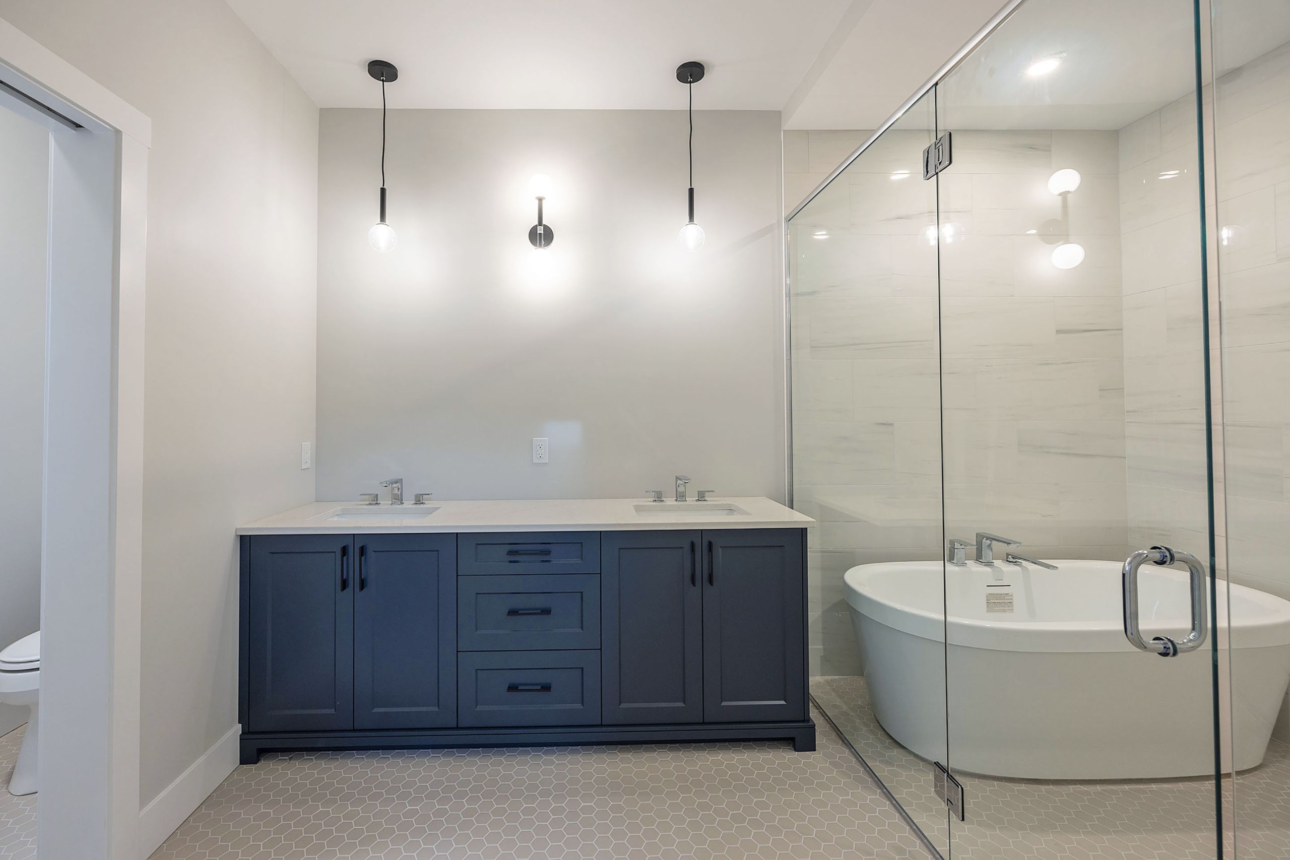 Four-piece ensuite off master bedroom including a free-standing soaker tub, tiled walk-in shower, and large walk-in closet