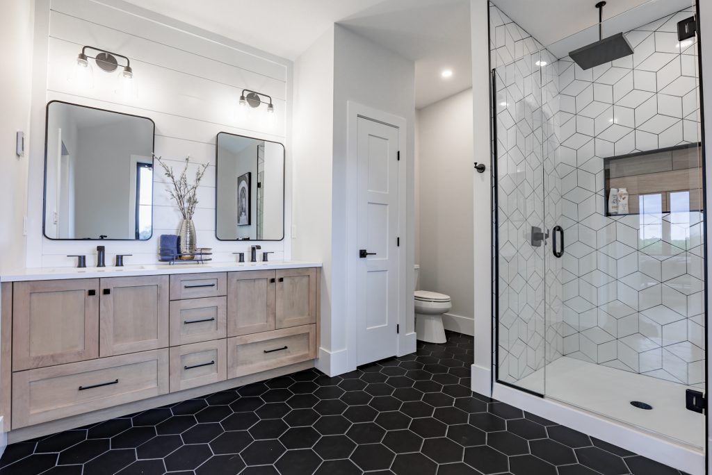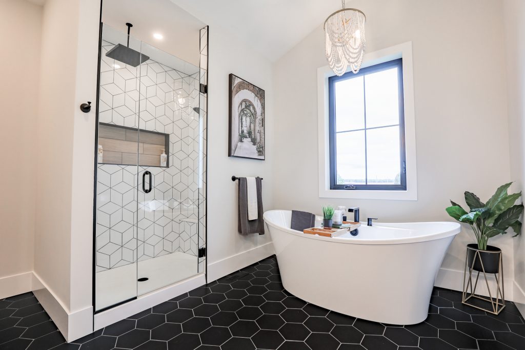 Four-piece ensuite with custom tiled shower off master bedroom