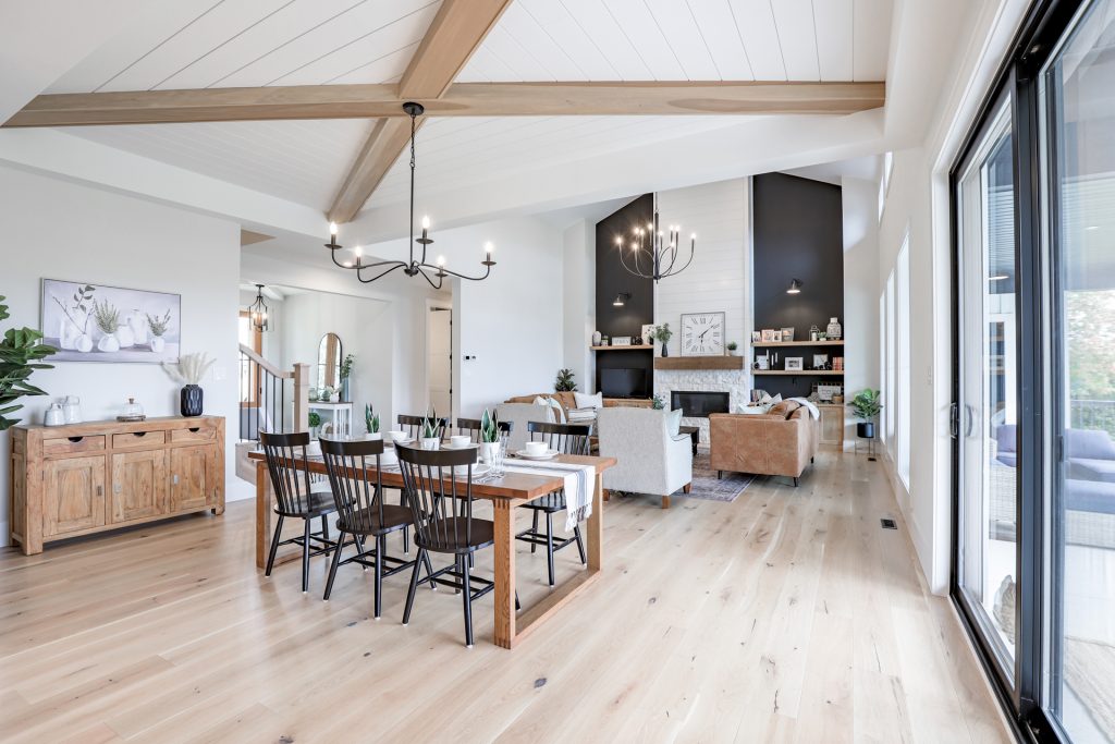 14’ cathedral ceiling in the great room, and 10’ ceiling with shiplap and beams in the dining room