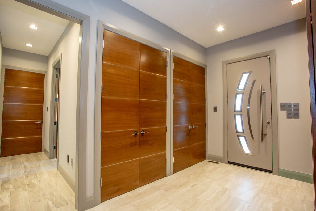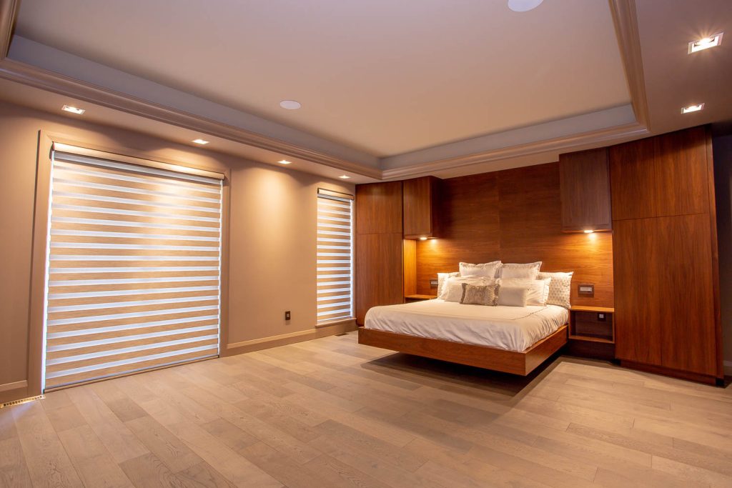 Large primary bedroom with built-in cabinets around the bed, large walk-in closet finished with custom cabinetry