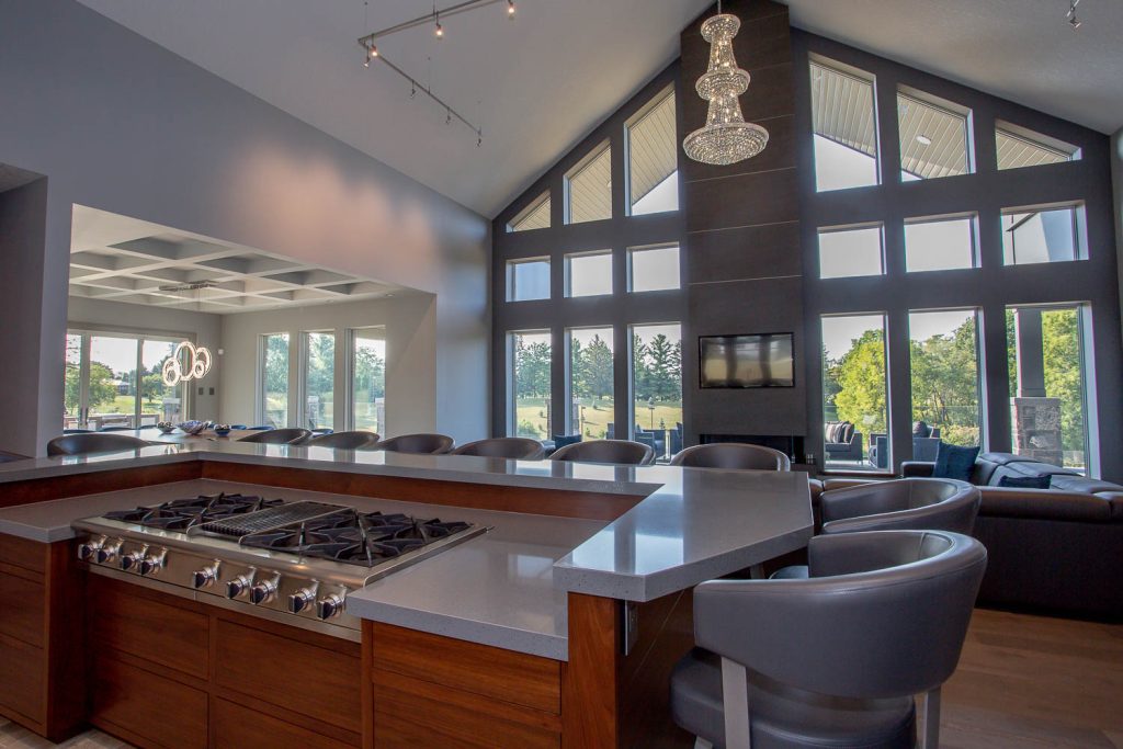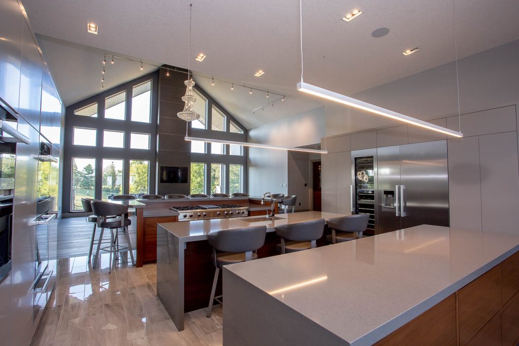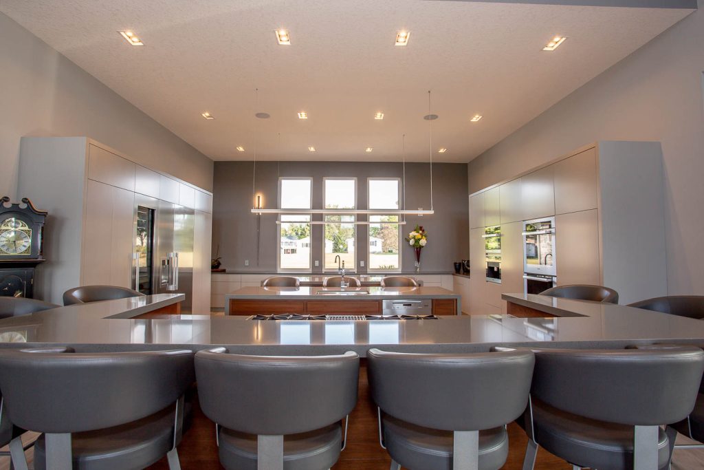 Kitchen designed with three custom islands: one island sits ten people, and one island sits three.