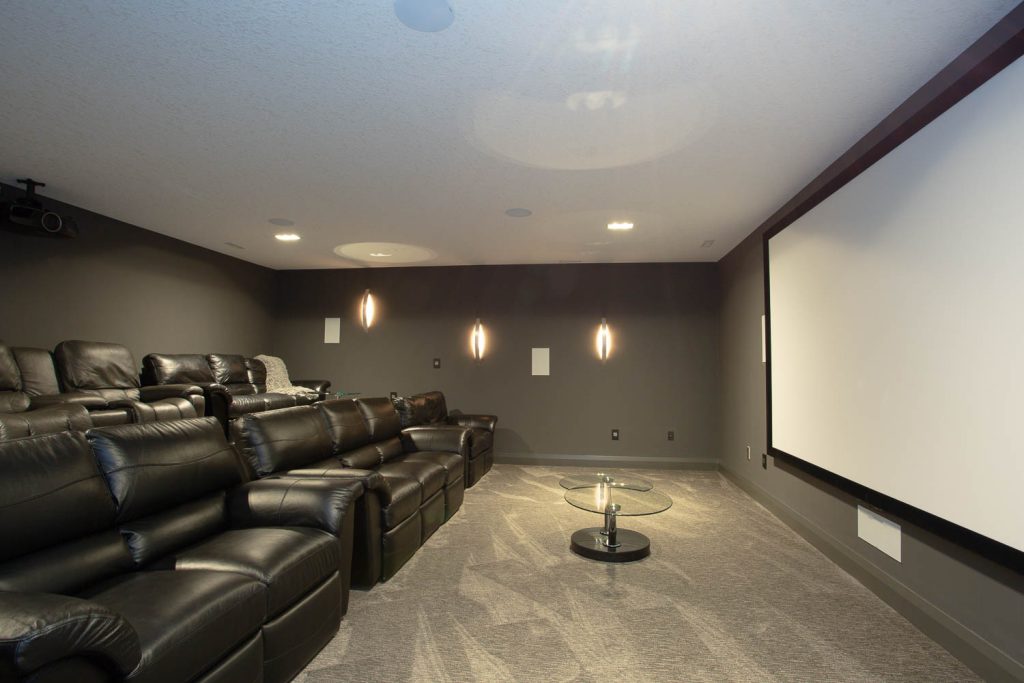 Theatre room with built-in surround sound, two row seating and large projection screen