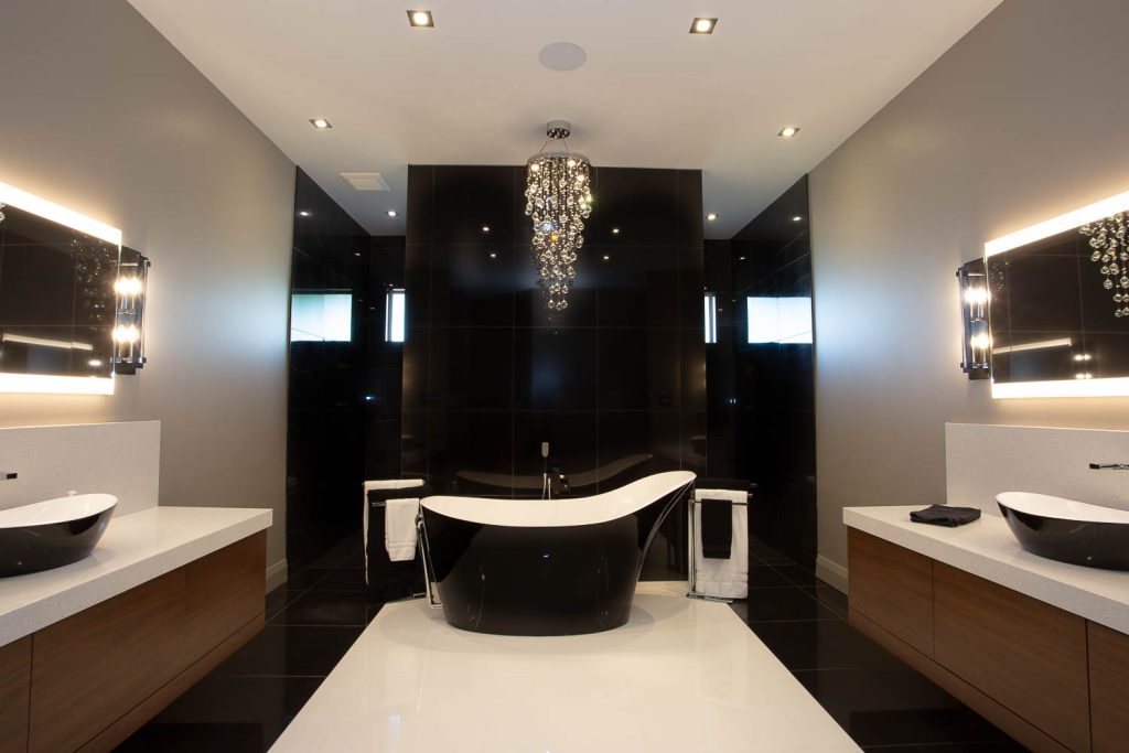 Primary ensuite finished with his and her vanities, walk-through shower, freestanding tub, and water closet