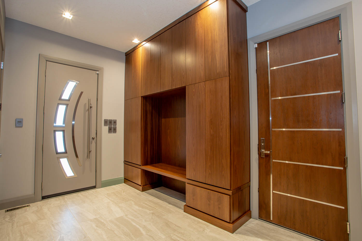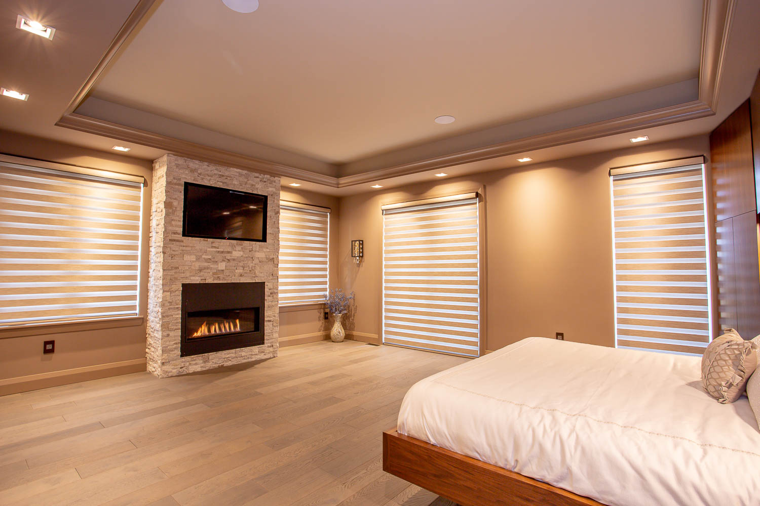 Large primary bedroom with built-in cabinets around the bed, large walk-in closet finished with custom cabinetry
